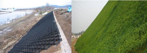 土工格室防護(hù)邊坡是將土工格室與植草相結(jié)合而形成的一種新型護(hù)坡形式,在格室側(cè)壁與土體產(chǎn)生的摩擦力和格室對(duì)土體的側(cè)限約束力共同作用下,形成一個(gè)輕型網(wǎng)狀結(jié)構(gòu)體,這種結(jié)構(gòu)體改變了坡面水流的流向,使水流主要沿格室邊緣流動(dòng),延長(zhǎng)了水流的流徑,使水流的動(dòng)能部分消耗在格室上,坡面水流的徑流量和流速均可降低,起到了很好的消能作用,減輕了水流對(duì)坡面的沖蝕,在工程建設(shè)中得到越來(lái)越廣泛的利用。
